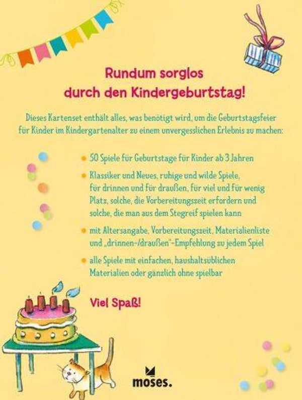 Klassiker und Neues - 50 Spiele für den Kindergeburtstag im Kindergartenalter vereint bekannte Klassiker mit neuen, aufregenden Spielen für den Geburtstag! Lustige Spiele wie Die Mumie oder Inselhopsen sorgen für eine Extraportion Spaß während der Feier. Für aktive Kinder gibt es zahlreiche Bewegungsspiele und eine praktische "drinnen-/draußen"-Empfehlung. Für alle Kinder ist etwas dabei: von wild bis ruhig, von viel zu wenig Platz. So wird die Geburtstagsfeier zu einem unvergesslichen Erlebnis!