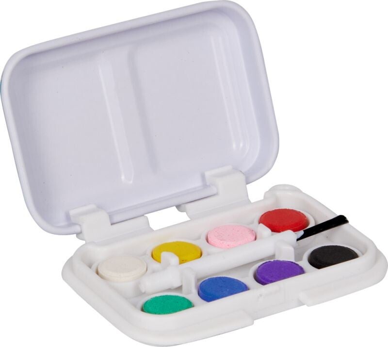 Bunte Geschenke für kleine Künstler auf Reisen: Malkasten im Pocket-Format. Mit acht Farben auf Wasserbasis und einem kleinen Pinsel. Erhältlich in drei Designs.
