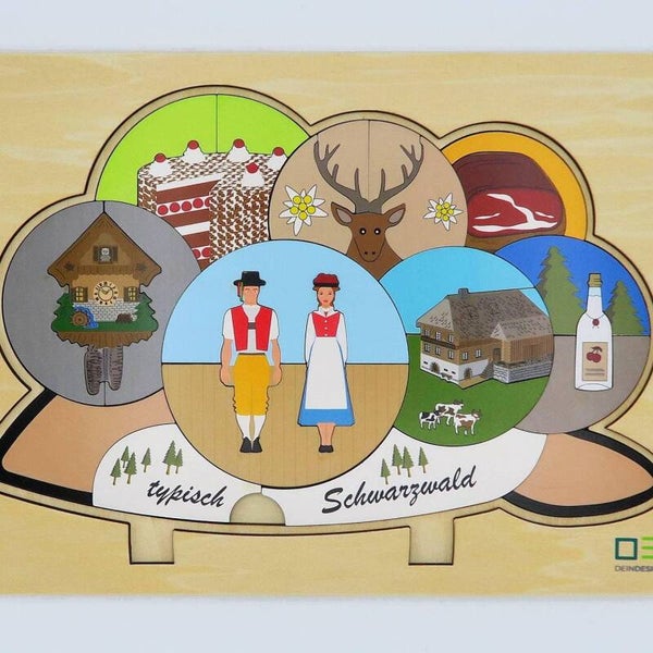 Den Schwarzwälder Bollenhut aus Gutach kennst Du bestimmt. Doch was ist für Dich außerdem noch typisch Schwarzwald? Puzzle Dich durch die Ebenen und entdecke Blick für Blick, was den Schwarzwald sonst noch ausmacht. Bei diesem „Blick-Durch-Puzzle“ liegen zwei Puzzle-Schichten übereinander. Mit jedem Puzzleteil, welches Du herausnimmst, bekommst Du einen tieferen Einblick. Ebene 1: 13 Puzzleteile Ebene 2: 30 Puzzleteile Grundplatte: 1 Puzzleteil Gesamt : 44 Puzzleteile Wenn Du glaubst, dieses „Blick-Durch-Puzzle“ sei einfach, nur weil es zwei Ebenen hat, dann hast Du Dich getäuscht. Es kann Dir passieren, dass Du es fast geschafft hast, und plötzlich musst Du feststellen, dass die roten Kugeln doch anders auf dem Hut platziert werden müssen. Marke : DEINDESIGNWERK Artikel-Nr : 10101001 Motiv : Schwarzwälder Bollenhut. Besonderheiten Qualitativ hochwertiges Puzzle aus Holzbeim Puzzleerlebnis das Innenleben eines Schwarzwaldhofes kennenlernen. Material Holz