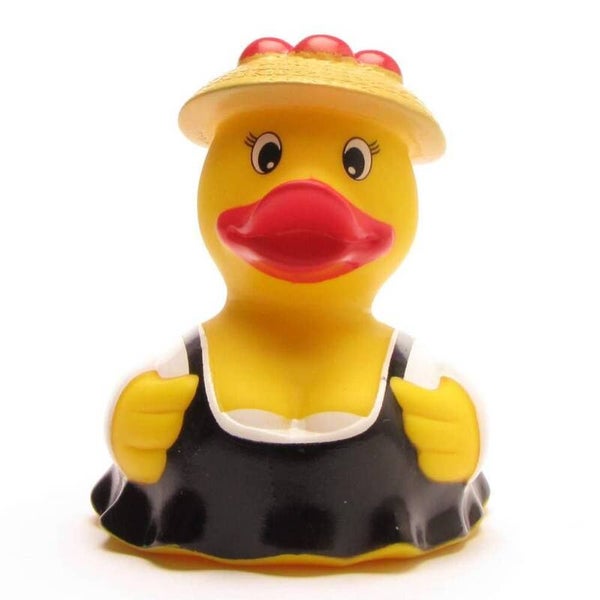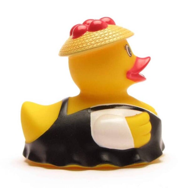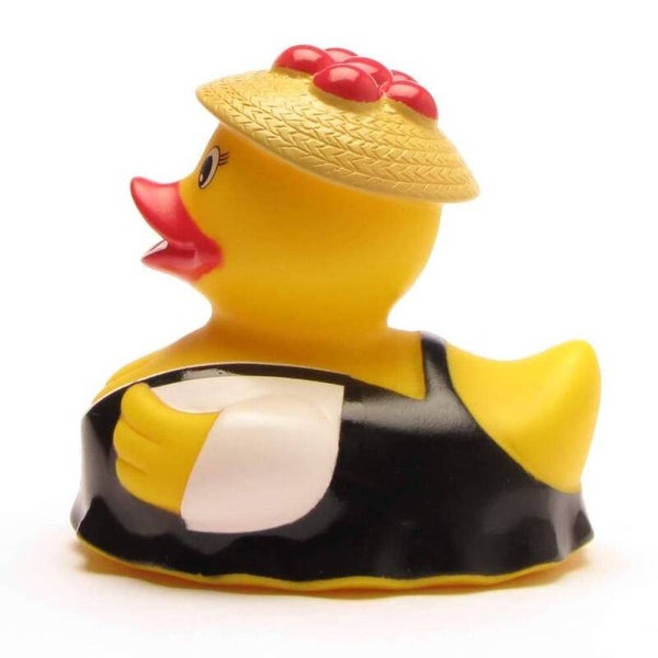 Mit der traditionellen Schwarzwald Tracht und dem dazugehörenden Bollenhut präsentiert sich diese niedliche Quietscheente. Maße: L: 7,5 cm B: 7,5 cm H: 8 cm Quietscheloch: Ja Schwimmt aufrecht: Nein Material: Vinyl Altersempfehlung: Für Kinder ab 18 Monaten