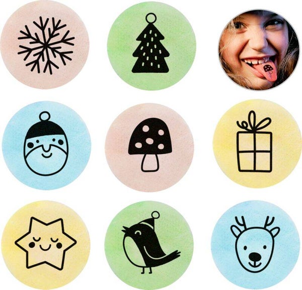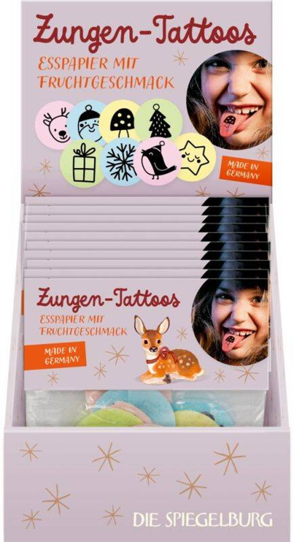 Die Zungentattoos – Weihnachten von Die Spiegelburg sorgen für leckeren Spaß in der Adventszeit! Die ca. 30 Esspapier-Oblaten in vier fruchtigen Geschmacksrichtungen bringen winterliche Motive direkt auf die Zunge – einfach auflegen, andrücken, ablösen und staunen! Mit einer Verpackungsgröße von ca. 11 x 14 x 1 cm sind die süßen Tattoos eine tolle Ergänzung für den Nikolausstiefel und den selbstbefüllten Adventskalender.