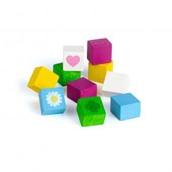 Inhalt: Mehrere bunte Schokowürfel aus Holz und eine Dose.