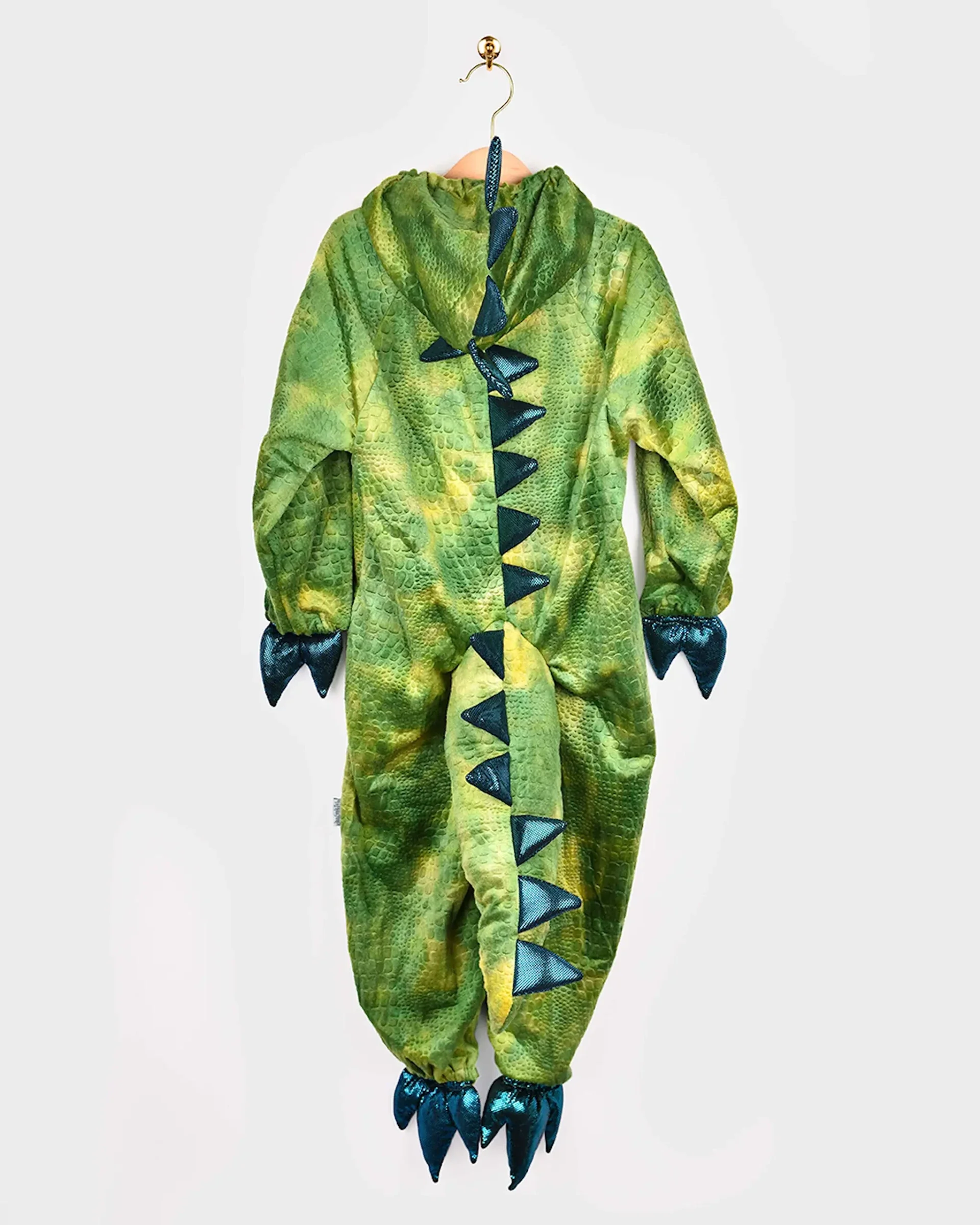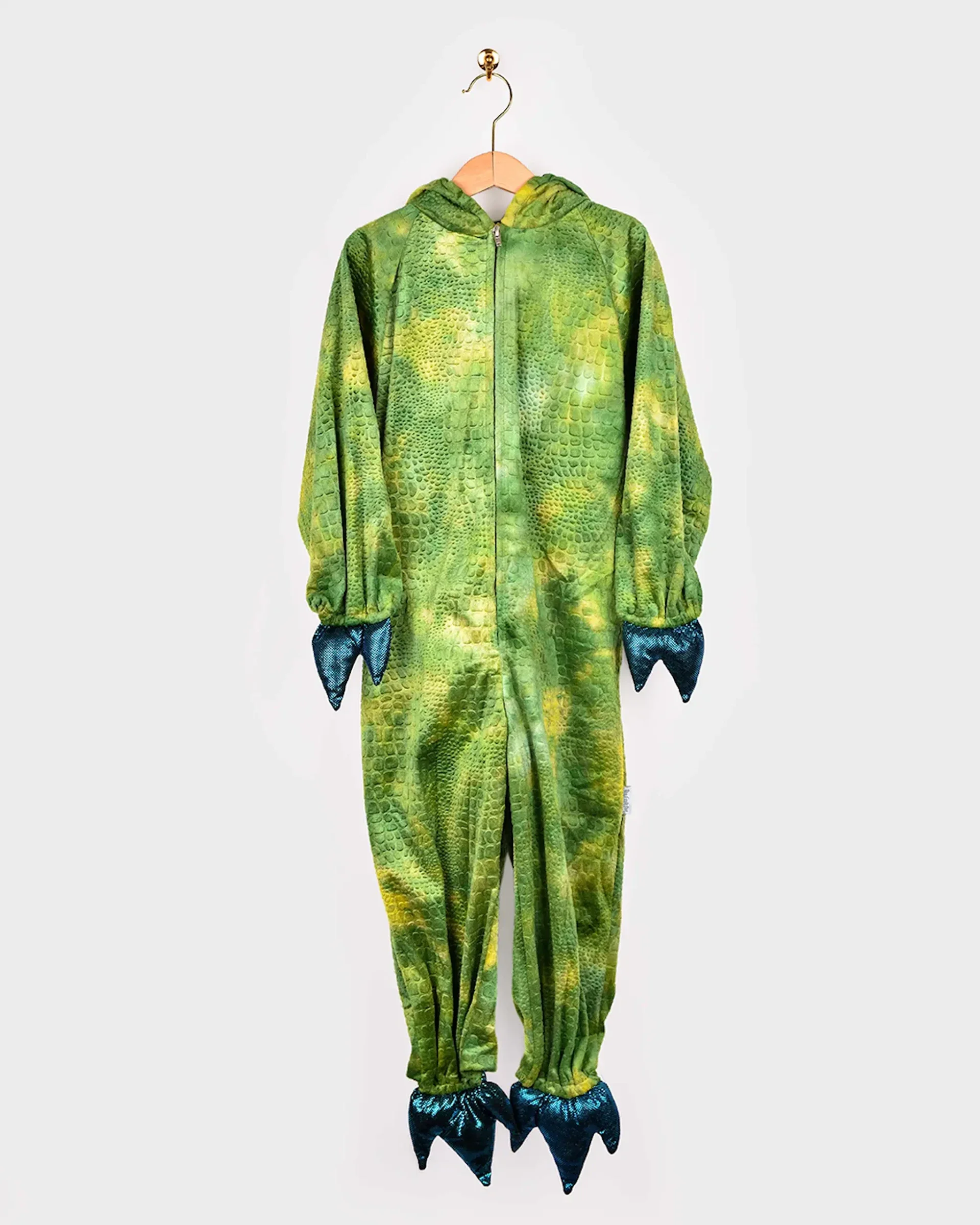 Mit diesem coolen Dinosaurier Jumpsuit von Den Goda Fen tauchst du in ein prähistorisches Abenteuer ein! Der grüne Overall verfügt über eine Kapuze mit wattierten, metallisch-blauen Stacheln und Krallen, sodass du sofort wie ein echter Dino aussiehst. Dank des praktischen Frontreißverschlusses lässt sich das Kostüm leicht an- und ausziehen.